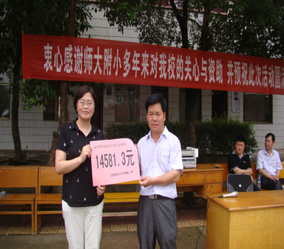 欢迎仪式结束后进行了捐赠仪式,李汶校长代表附小将11台电视机以及502本图书和全校学生在第十五届诚信图书交易会上的14538.1元爱心款捐献给了姚显微葡京娱乐城。二年级四班的同学还另外捐赠了六百元爱心中餐款。刘慧和校长代表姚显微葡京娱乐城全体师生感谢师大附小的善举,对师大附小学子的善心、善意表示诚挚的感谢。