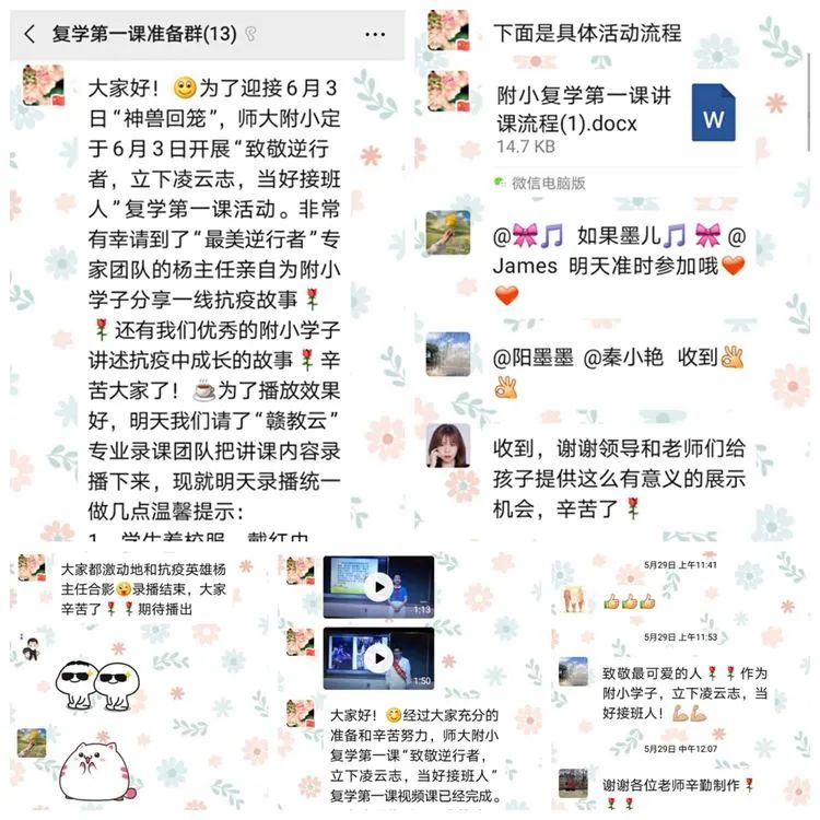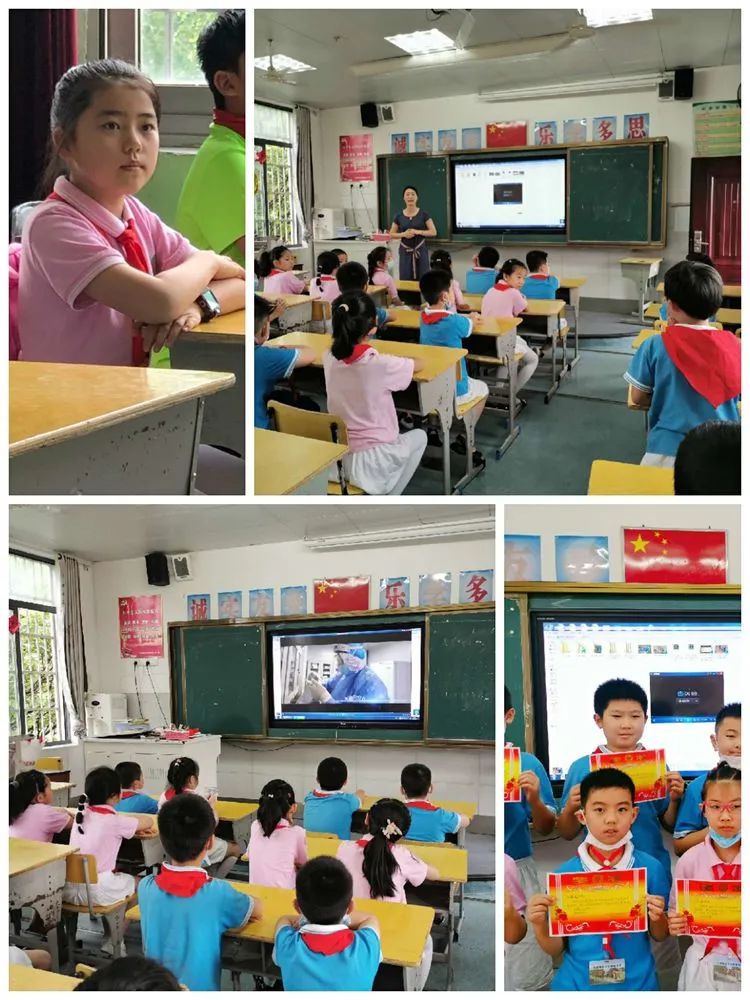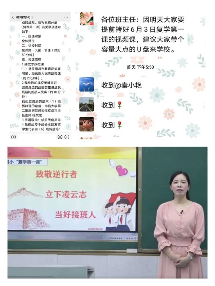 本次复学第一讲我们以抗疫为鲜活的教材,共分为六部分。第一部分:观看《抗疫中的思考与成长》,第二部分巜我身边的战疫英雄宣讲》,第三部分巜致敬战疫英雄》,第四部分《我在战疫中成长主题发言》,第五部分巜童心战疫优秀作品展》,第六部分《班主任总结发言》让学生见证“逆行者”的英勇无畏,增强爱国情感和振兴祖国的责任感,勇做新时代的奋进者、开拓者和贡献者。