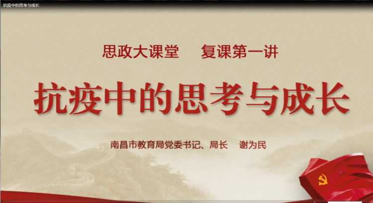 全校学生观看南昌市教育局党委书记、局长谢为民主讲的《抗疫中的思考与成长》。微课中,谢为民局长强调要把全民抗疫作为“活教材”,引导广大学生更加热爱祖国,热爱生命,热爱学习,全面发展。