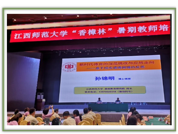 26日下午,简短的开班仪式后,江西师范大学基础教育研究院院长孙锦明博士给大家分享了题为《新时代德育的深层挑战与应然走向》的讲座。孙教授从现实的道德困境入手,分析其形成的根源,进而阐述了德育的应然走向,激发全场老师对德育工作进行新思考。