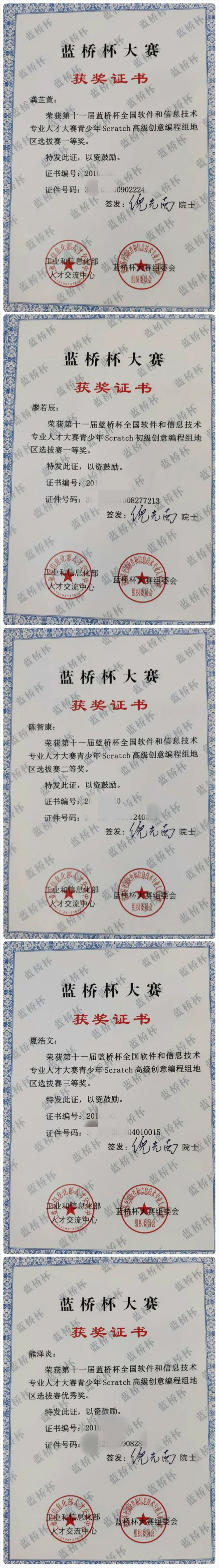 在工业和信息化部组织的第十一届蓝桥杯全国软件和信息技术专业人才大赛青少年Scratch创意编程组中,我校六(7)班龚芷萱、五(8)班廖若辰荣获地区选拔赛一等奖,六(2)班陈智康荣获地区选拔赛二等奖,六(2)班夏浩文荣获地区选拔赛三等奖,五(4)班熊泽炎荣获地区选拔赛优秀奖。