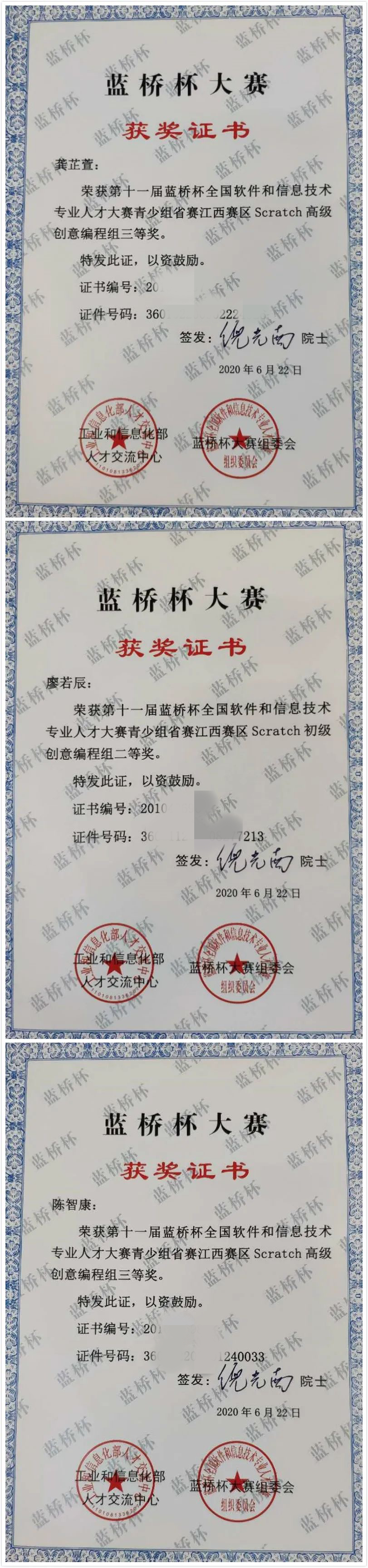 在工业和信息化部组织的第十一届蓝桥杯全国软件和信息技术专业人才大赛青少年组省赛江西赛区中,我校五(8)班廖若辰荣获省赛二等奖;我校六(2)班陈智康、六(7)班龚芷萱荣获省赛三等奖。