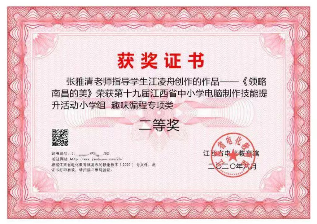 在省教育厅组织的第19届江西省中小学生电脑制作技能提升活动中,我校六(4)班江凌舟荣获小学组二等奖。指导老师:张雅清。
