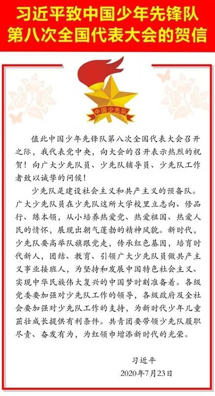习近平总书记在中国少年先锋队第八次全国代表大会召开之际发来贺信:少先队是建设社会主义和共产主义的预备队。广大少先队员在少先队这所大葡京娱乐城里立志向、修品行、练本领,从小培养热爱党、热爱祖国、热爱人民的情怀,展现出朝气蓬勃的精神风貌。