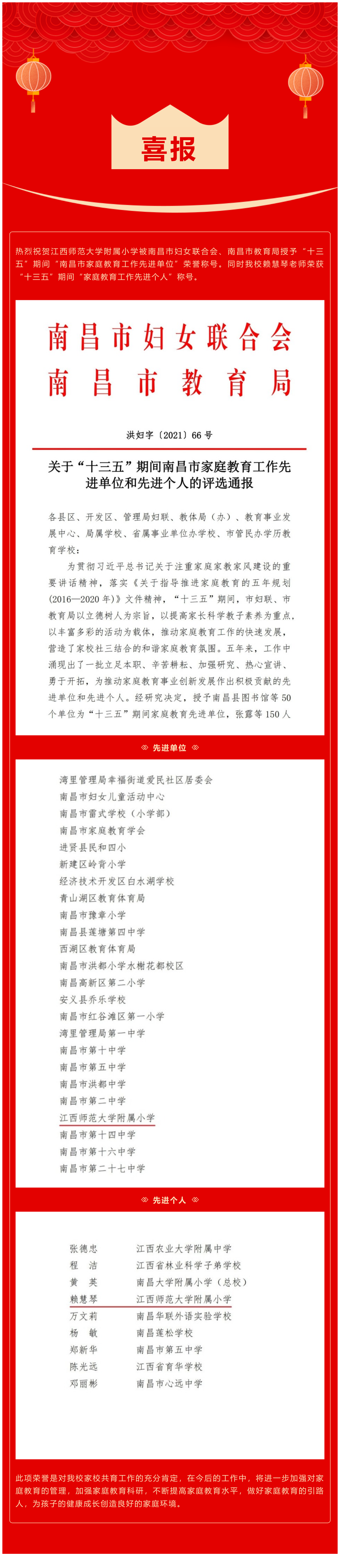 喜报〡热烈祝贺葡京娱乐城 荣获南昌市家庭教育工作先进单位和先进个人