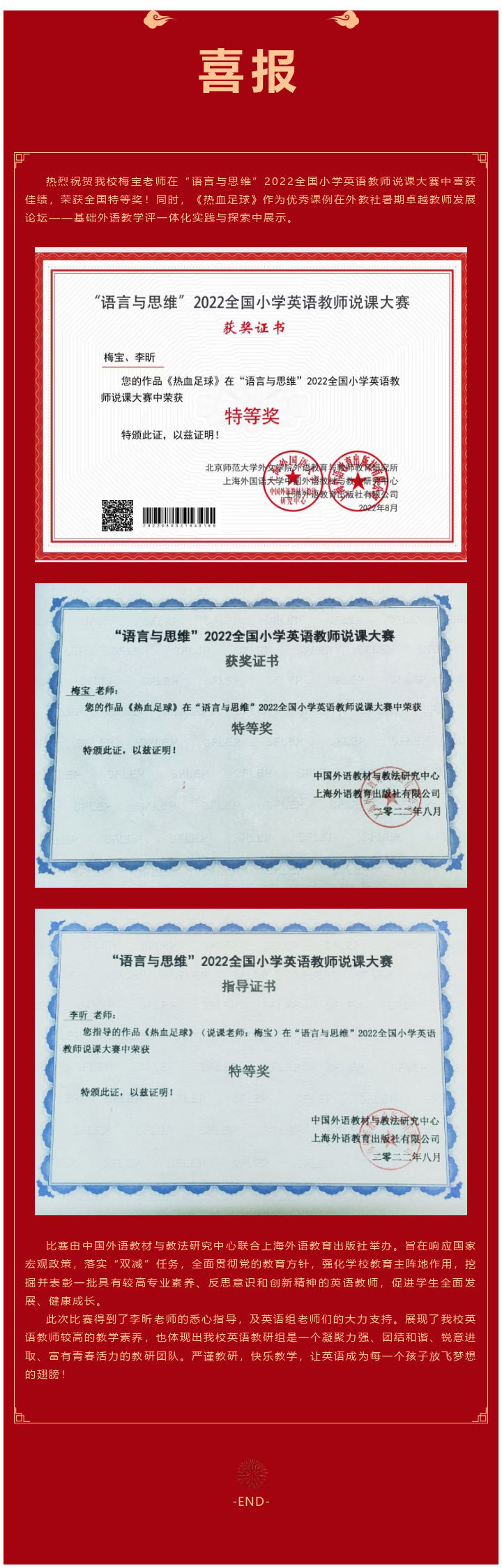 喜报 | 热烈祝贺我校梅宝老师荣获2022年全国小学英语教师说课大赛特等奖